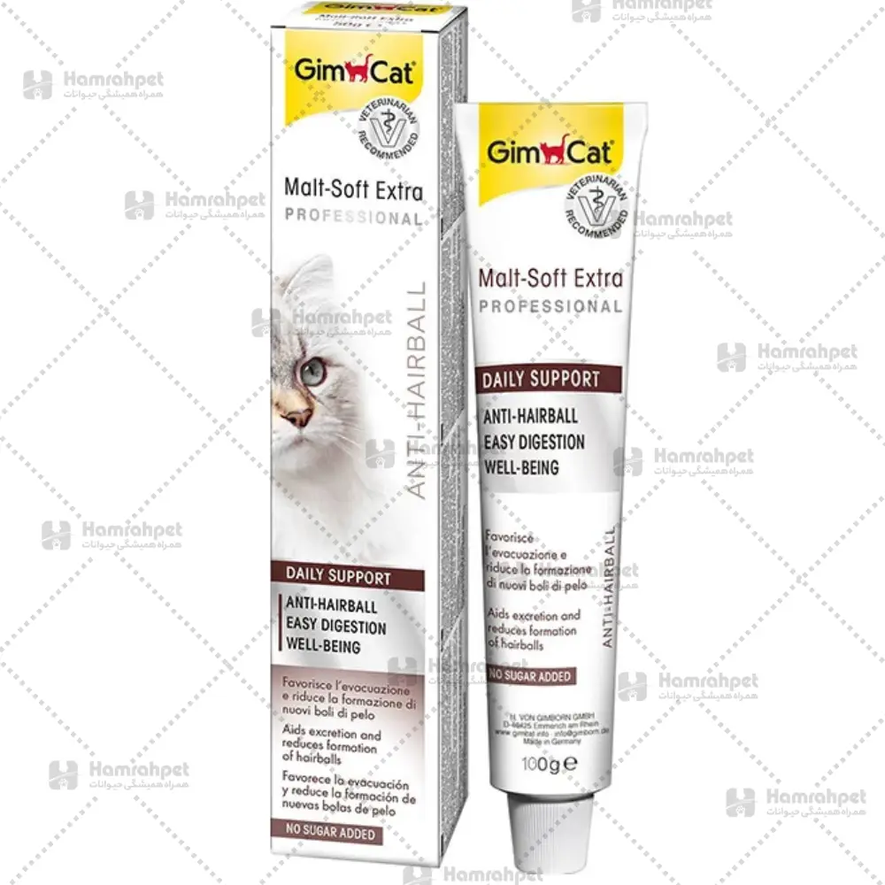 خمیر GimCat Malt-Soft Extra Professional یکی از بهترین محصولات مراقبتی برای گربههاست که به طور ویژه برای پیشگیری و دفع گلولههای مویی (Hairball) طراحی شده است.این خمیر با ترکیب مؤثری از مالت طبیعی، روغنها، فیبرها و ترکیبات گوارشی به عملکرد طبیعی روده کمک میکند و مانع تجمع مو در معده و روده گربه میشود.همچنین با طعم دلپذیر و بافت نرم خود، گربهها به راحتی آن را میپذیرند و میتوان از آن به صورت مستقیم یا مخلوط با غذا استفاده کرد.